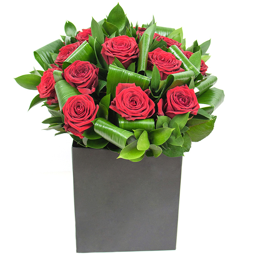Add a touch of elegance to your home with our exquisite bouquet, featuring vibrant red roses, lush aspidistra leaves, and fresh ruscus. This unique floral arrangement exudes style and sophistication.